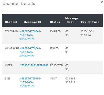 By clicking on Channel Details you’ll see the Channel, Message ID, Status, Message Cost and Expiry time.